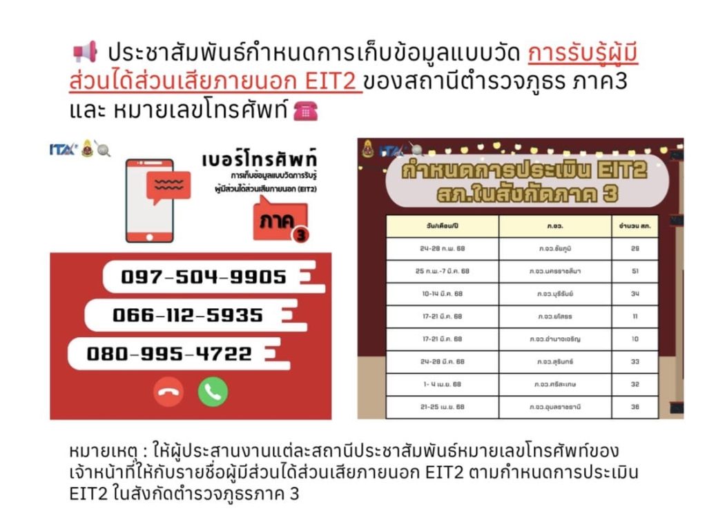 2. EIT2 แจ้งหมายเลขโทรศัพท์ ป.ป.ช. ที่จะโทรศัพท์มาสอบถาม จำนวน 3 หมายเลข และห้วงเวลา วันที่ 17-21 มีนาคม 2568 ซึ่งจะได้ทำหนังสือแจ้งผู้มีรายชื่อได้ทราบ ป้องกันการเข้าใจผิด