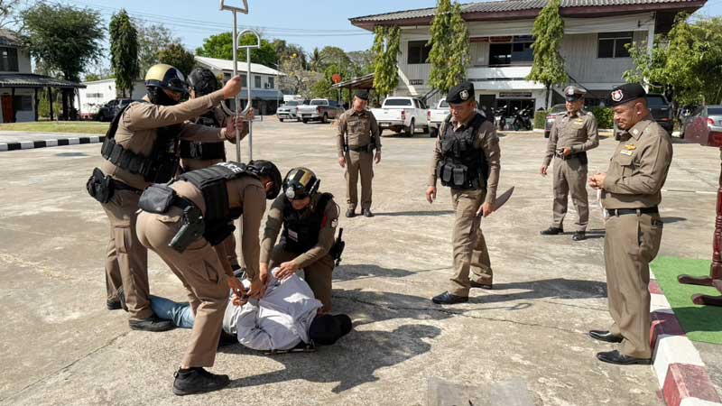 2. ประชุมชี้แจงบุคลากรเตรียมความพร้อม ของ สภ.ฯ ตรวจสอบอาวุธยุทโธปกรณ์ และให้คำแนะนำในการปฏิบัติยุทธวิธีการใช้ไม้ง่ามระงับเหตุ เพื่อนำไปปฏิบัติให้ได้อย่างถูกต้อง