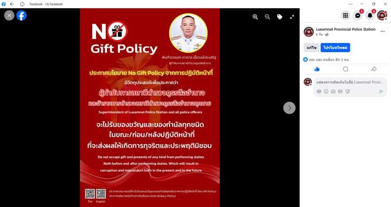 สถานีตำรวจภูธรลืออำนาจ โดย พันตำรวจเอก เทวราช เอื้อวงษ์ประเสริฐ ผู้กำกับการ สถานีตำรวจภูธรลืออำนาจ ประกาศ นโยบายไม่รับของขวัญและของกำนัลทุกชนิด (No Gift Policy) จากการปฏิบัติหน้าที่ และ นโยบายต่อต้านการรับสินบน (Anti-Bribery Policy) ลงวันที่ 1 ตุลาคม 2567