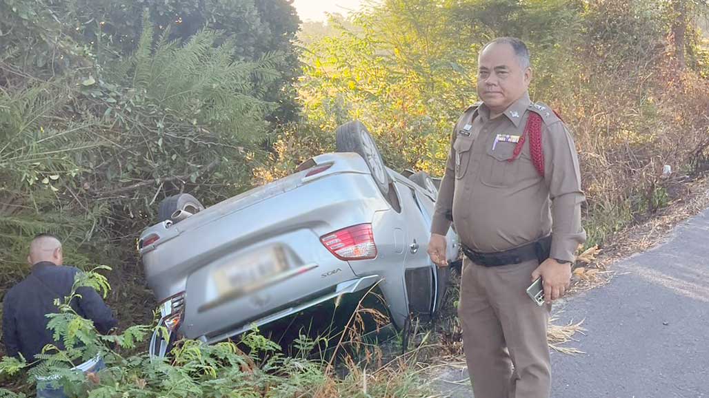 ตรวจสถานที่เกิดเหตุรถยนต์เสียหลักพลิกคว่ำ