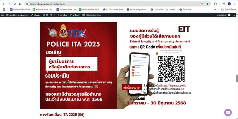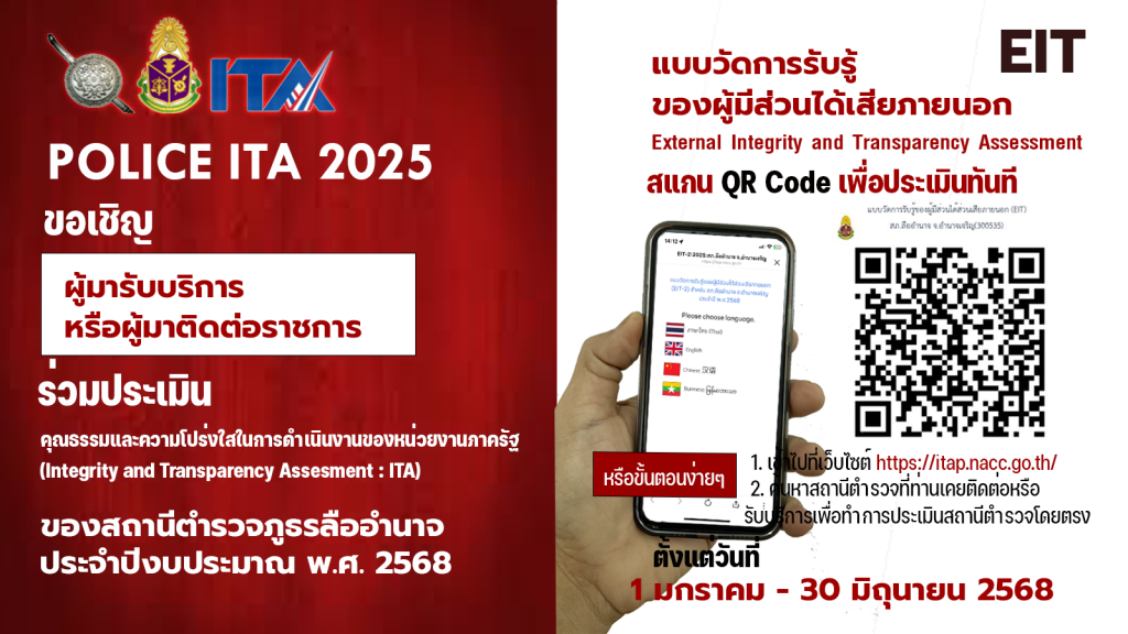 สถานีตำรวจภูธรลืออำนาจ จังหวัดอำนาจเจริญ จัดทำป้ายประชาสัมพันธ์และเชิญชวนผู้มารับบริการ/มาติดต่อ สถานีตำรวจ ร่วมจัดทำแบบการรับรู้ของผู้มีส่วนได้เสียภายนอก (Enternal Integrity Transparency Assesment : EIT) 2025 สำหรับนำไปพัฒนาปรับปรุงการให้บริการของสถานีตำรวจ โดยการสแกน QR Code ซึ่งได้ประชาสัมพันธ์ไว้ที่หน้าเว็บไซต์หลักของ สภ. https://lueamnat.amnatcharoen.police.go.th/